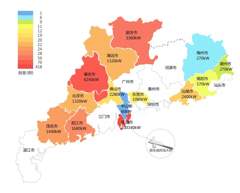 2018年,在港珠澳大桥充电桩项目中,江苏五亭龙科技集团有限公司在港珠澳大桥珠海端口岸人工岛搭建的充电管理平台及电能量采集终端,为大桥的绿色运营和电力保障提供技术支持。除此之外,仅广东省内,江苏五亭龙科技集团有限公司充电桩涵盖肇庆、珠海等14个城市,具体分布情况如下图所示。